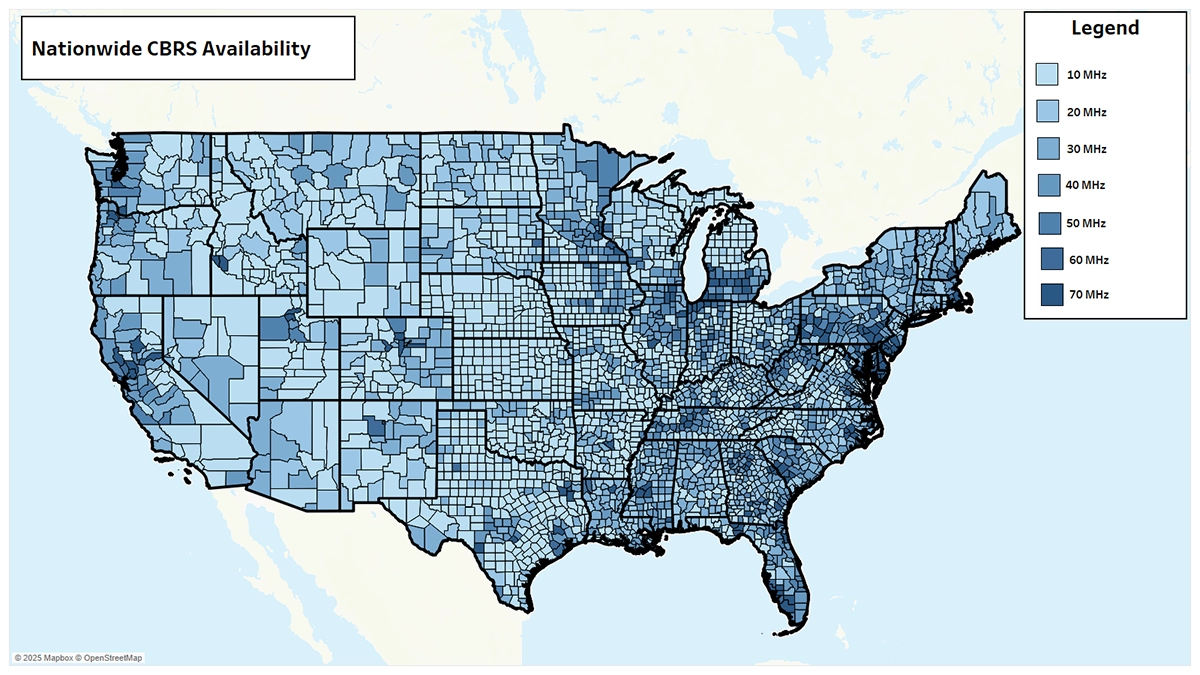 The Citizens Broadband Radio Service (CBRS) introduces dynamic spectrum sharing and ranges from 3550-3700 MHz. CBRS is governed by a three-tiered spectrum authorization framework: Incumbents(Federal Radar Location Systems, VIP users), Priority Access Licenses (PALs) and General Authorized Access (GAA). Access and operations to CBRS are managed by a dynamic Spectrum Access System (SAS).